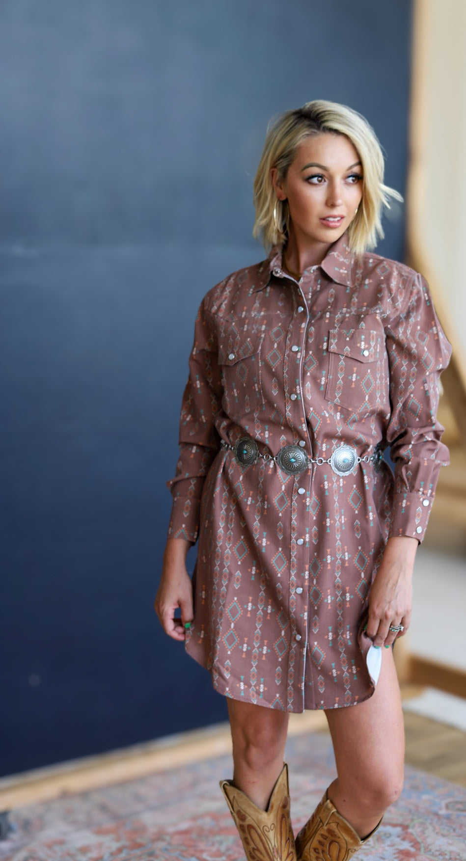 BROWN AZTEC PEARL SNAP LONG SLEEVE DRESS
