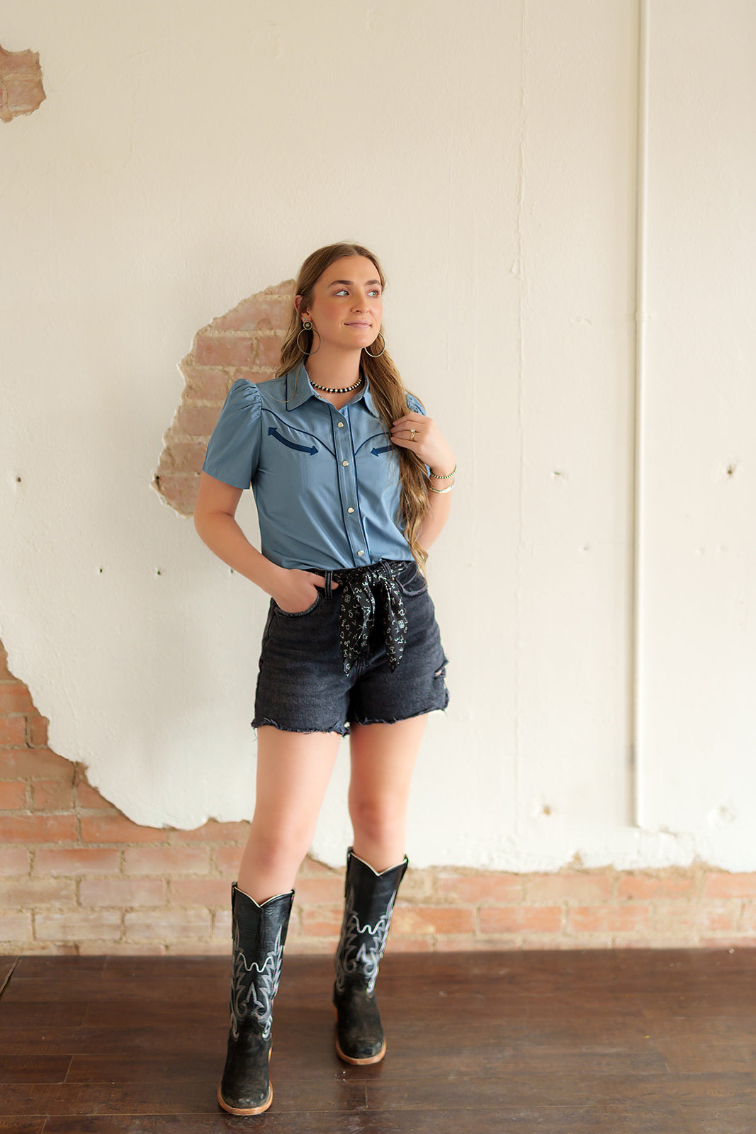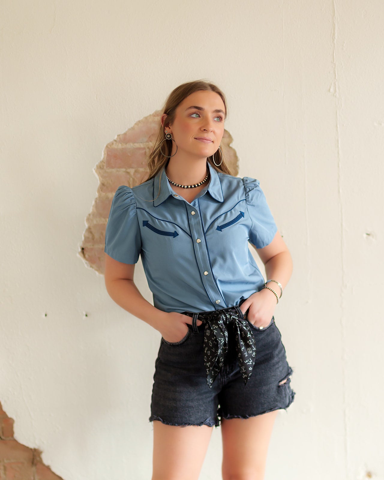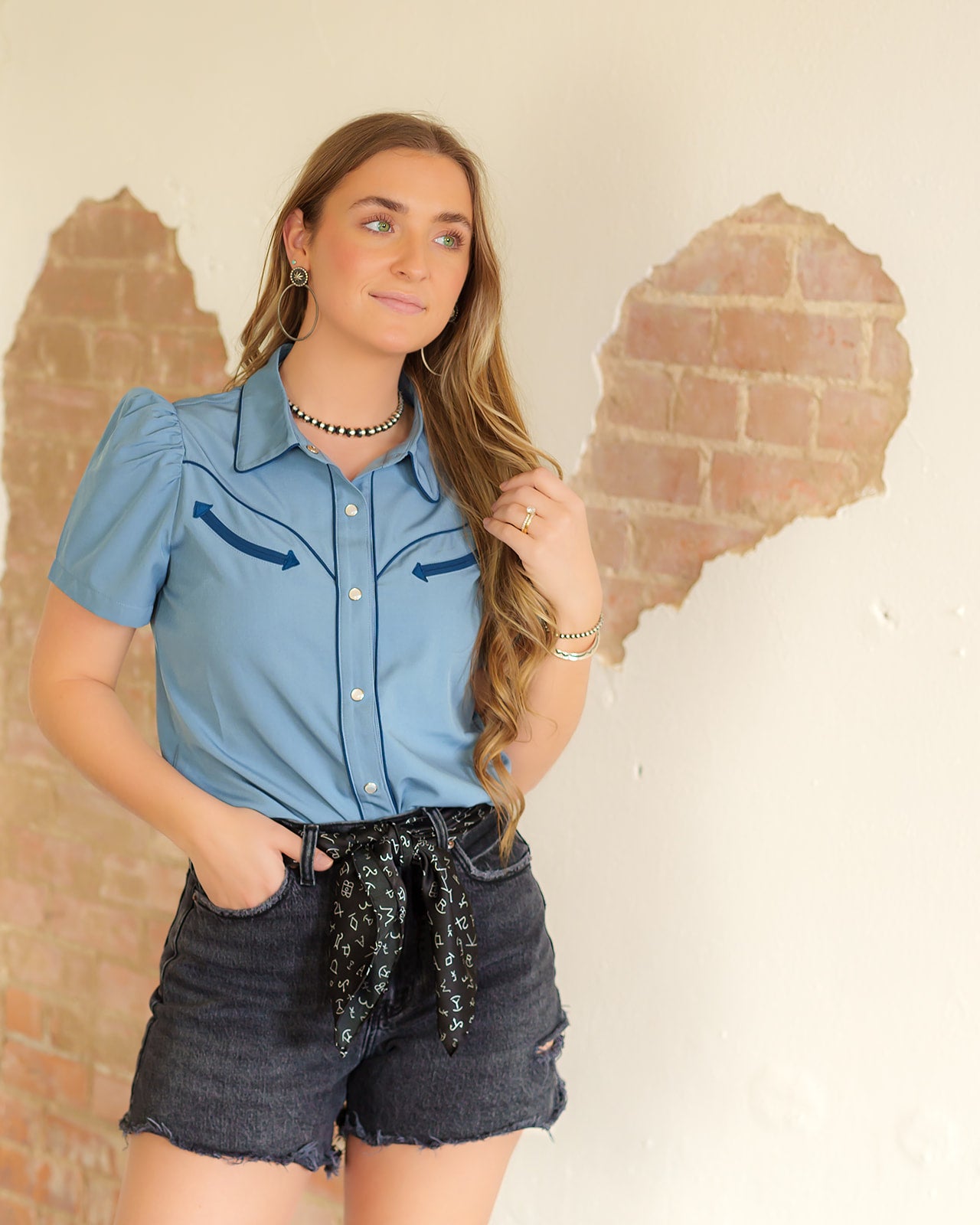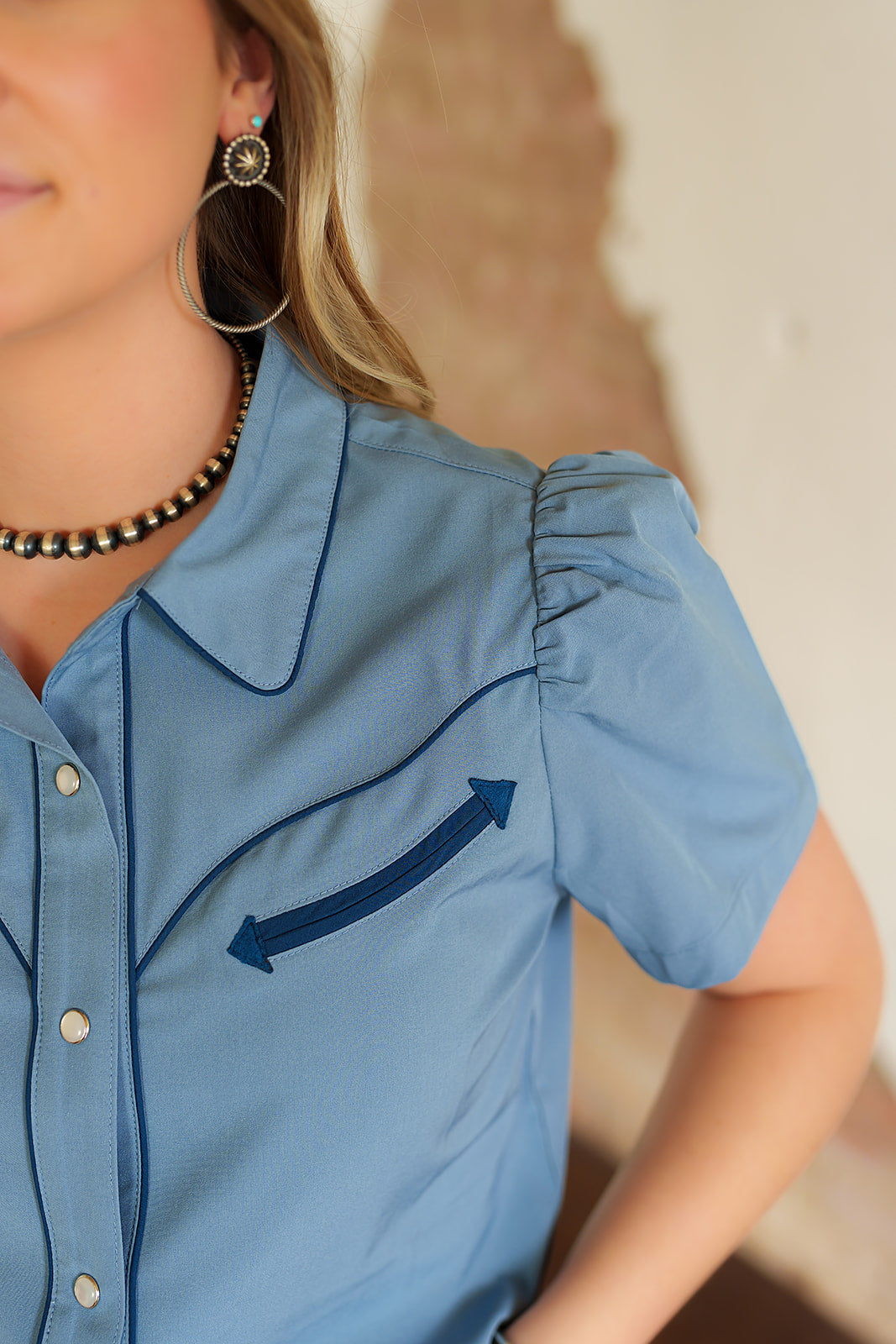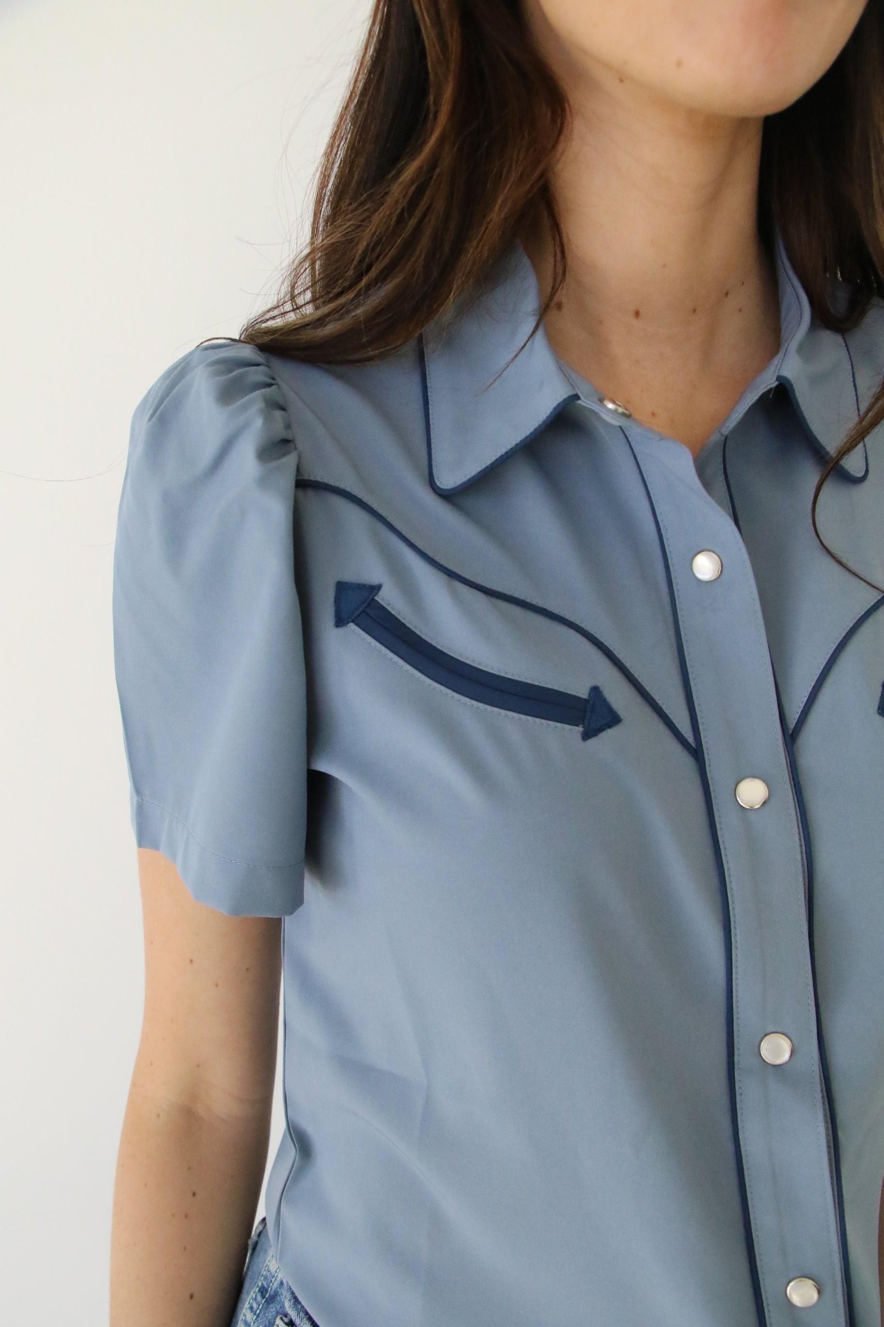 PRINTED SHORT SLEEVE PUFF PEARL SNAP TOP